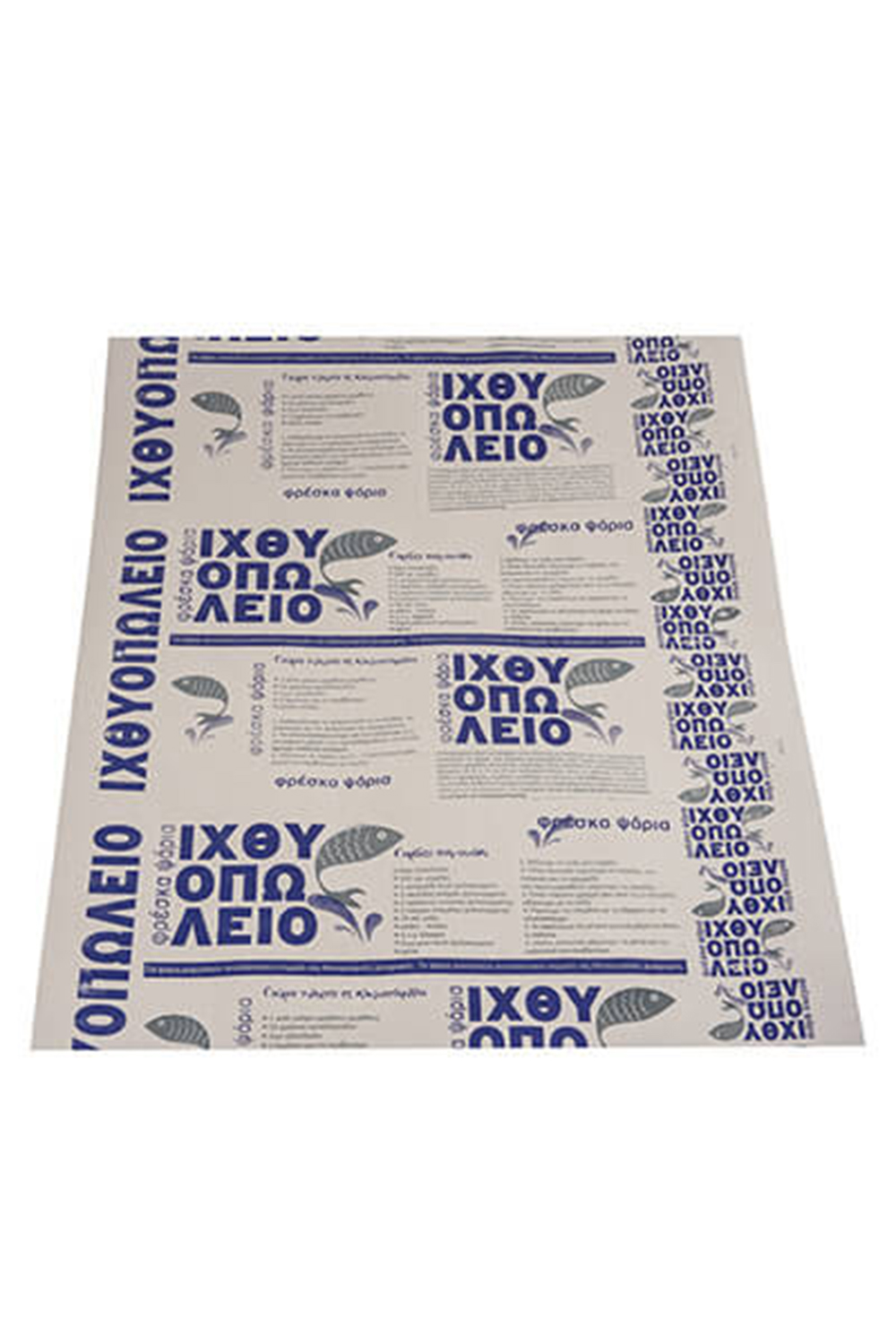 Χαρτί ιχθυοπωλείου 45×60 με εσωτερική μεμβράνη για συγκράτηση της υγρασίας των προϊόντων. Ιδανικό για ψαρικά, προστατεύει την ποιότητα και τη φρεσκάδα τους. Κατάλληλο για ιχθυοπωλεία και επιχειρήσεις που εμπορεύονται ψαρικά.