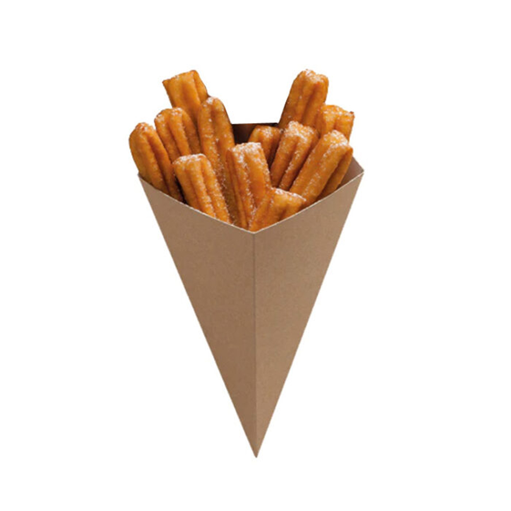 Το κουτί χάρτινο kraft cone, ιδανικό για takeaway σε τηγανητά ορεκτικά, waffle bites και finger food. Είναι κατασκευασμένο από ανθεκτικό kraft χαρτόνι, μη στεγανό, και παραδίδεται επίπεδο για εύκολη αποθήκευση. Αποτελεί πρακτική λύση για καταστήματα street food και γρήγορης εξυπηρέτησης.