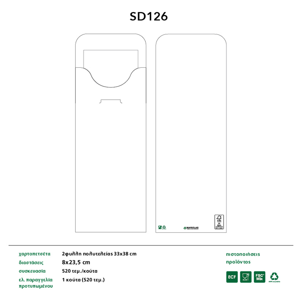 Οι θήκες για κουβέρ λευκές sd 126 με λευκή χαρτοπετσέτα 2φ 40x40cm (520 τμχ) αποτελούν ιδανική επιλογή για την υγειονομική προστασία των μαχαιροπίρουνων από την έκθεση στο περιβάλλον. Ιδανική επιλογή για πιο ασφαλές σερβίρισμα σε εστιατόρια, καφετέριες, ζαχαροπλαστεία, ξενοδοχεία και catering. Διατίθεται η δυνατότητα εκτύπωσης της επωνυμίας σας στις θήκες για κουβέρ λευκές sd 126 με λευκή χαρτοπετσέτα 2φ για ενίσχυση της εταιρικής σας ταυτότητας.