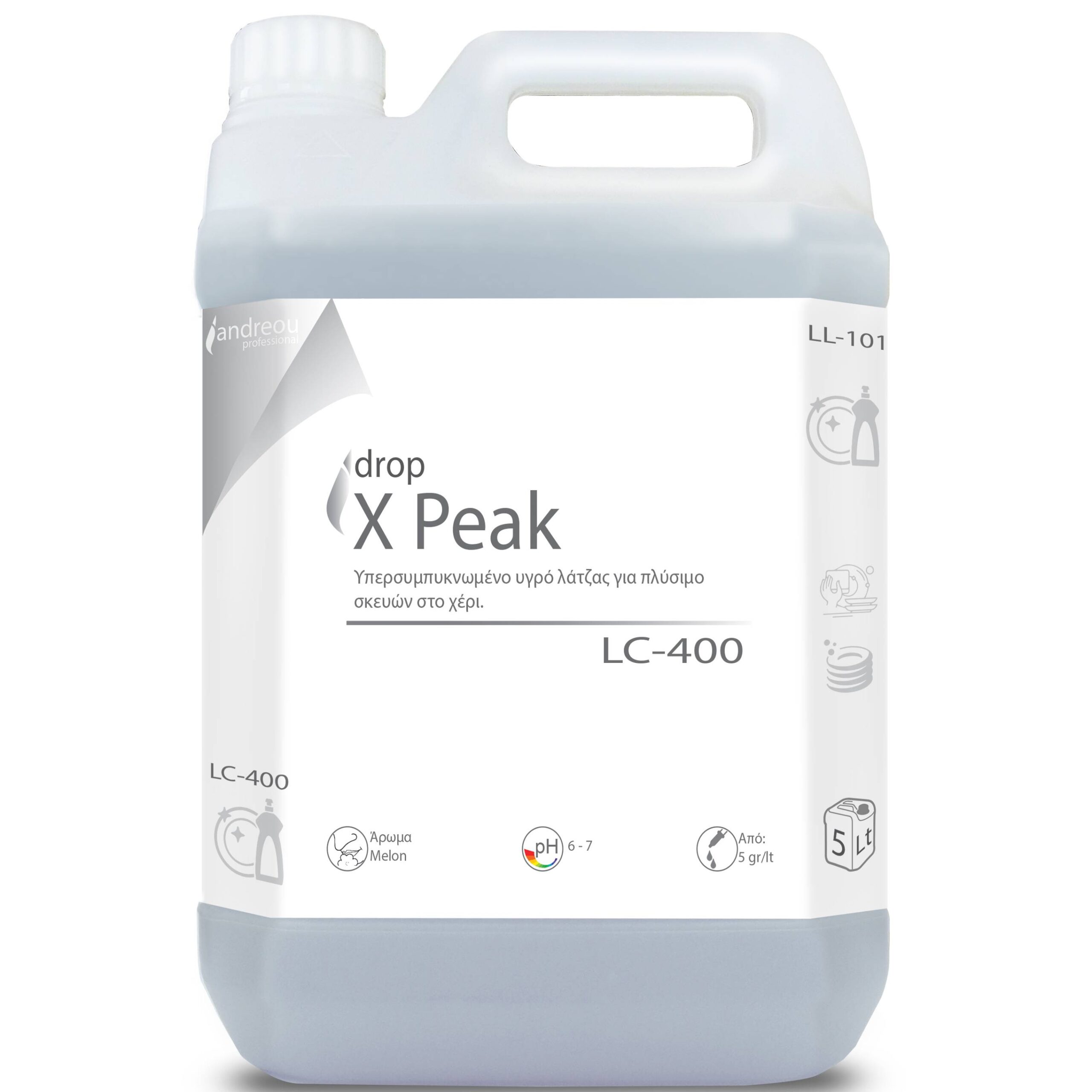 Υγρό πιάτων drop x peak 5 lt, υπερ-συμπυκνωμένο υγρό σαπούνι λάντζας για πλύσιμο σκευών στο χέρι, με ευχάριστο άρωμα πεπόνι. Ο υψηλός αφρισμός του αντιμετωπίζει αποτελεσματικά τα λίπη και τα υπολείμματα τροφών.
