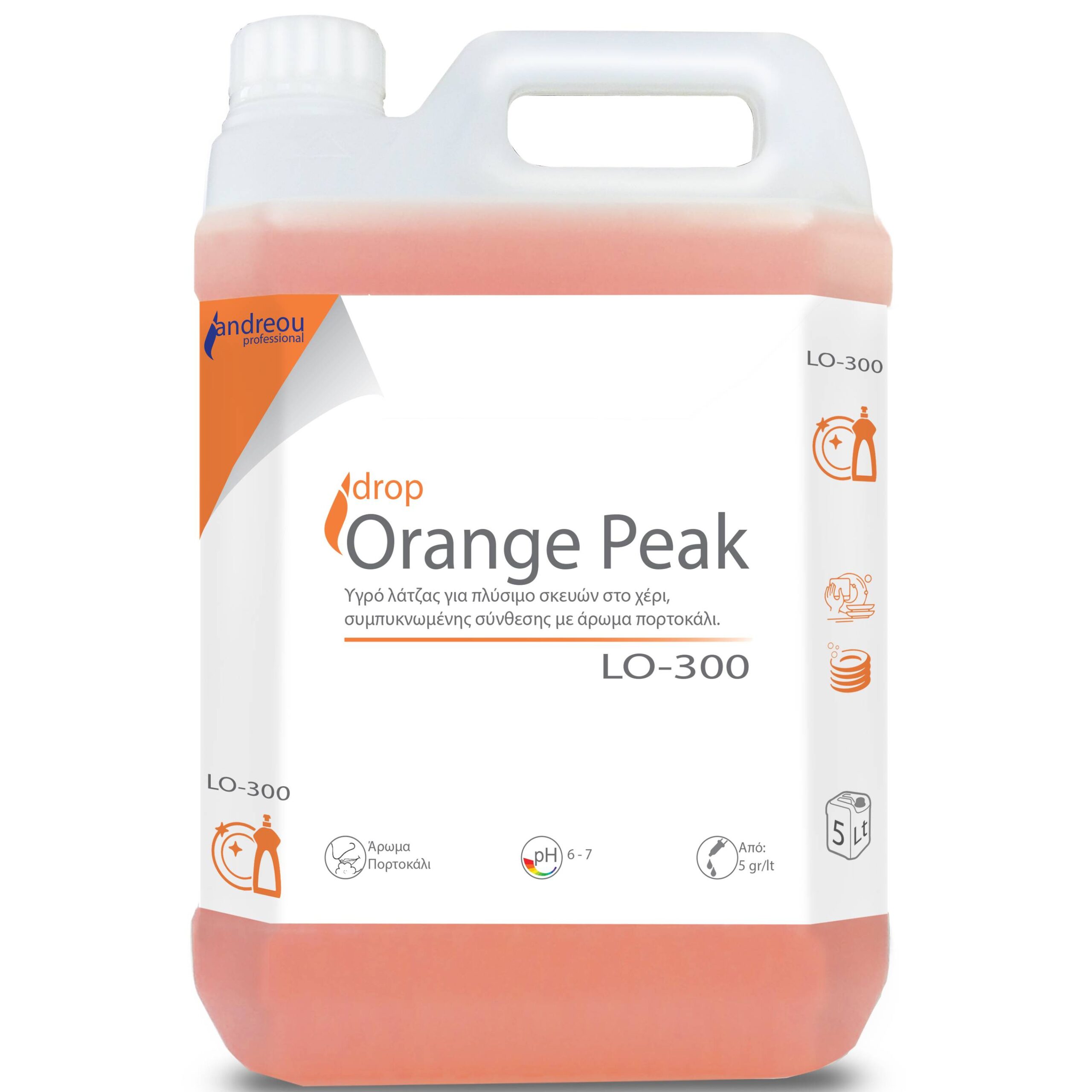 Υγρό πιάτων πορτοκάλι drop orange peak 5lt, συμπυκνωμένο υγρό σαπούνι λάντζας για πλύσιμο σκευών στο χέρι, με ευχάριστο άρωμα πορτοκάλι. Ο ελεγχόμενος αφρισμός του διαλύει εύκολα τα λίπη και τα υπολείμματα τροφών.